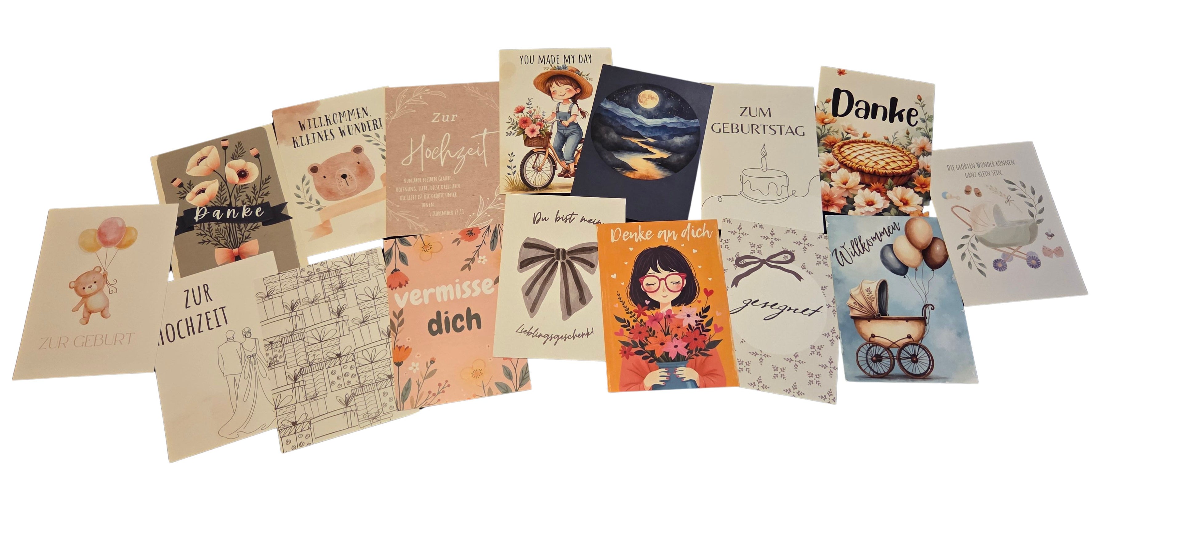 Dankeskarten, Geburtstagskarten, Hochzeitskarten, Verlobungskarten, Trauerkarten, Weihnachtskarten sowie vielseitige Motive unter Verschiedenes. Ob freudiger Anlass oder stiller Moment – hier findest du die passende Karte.